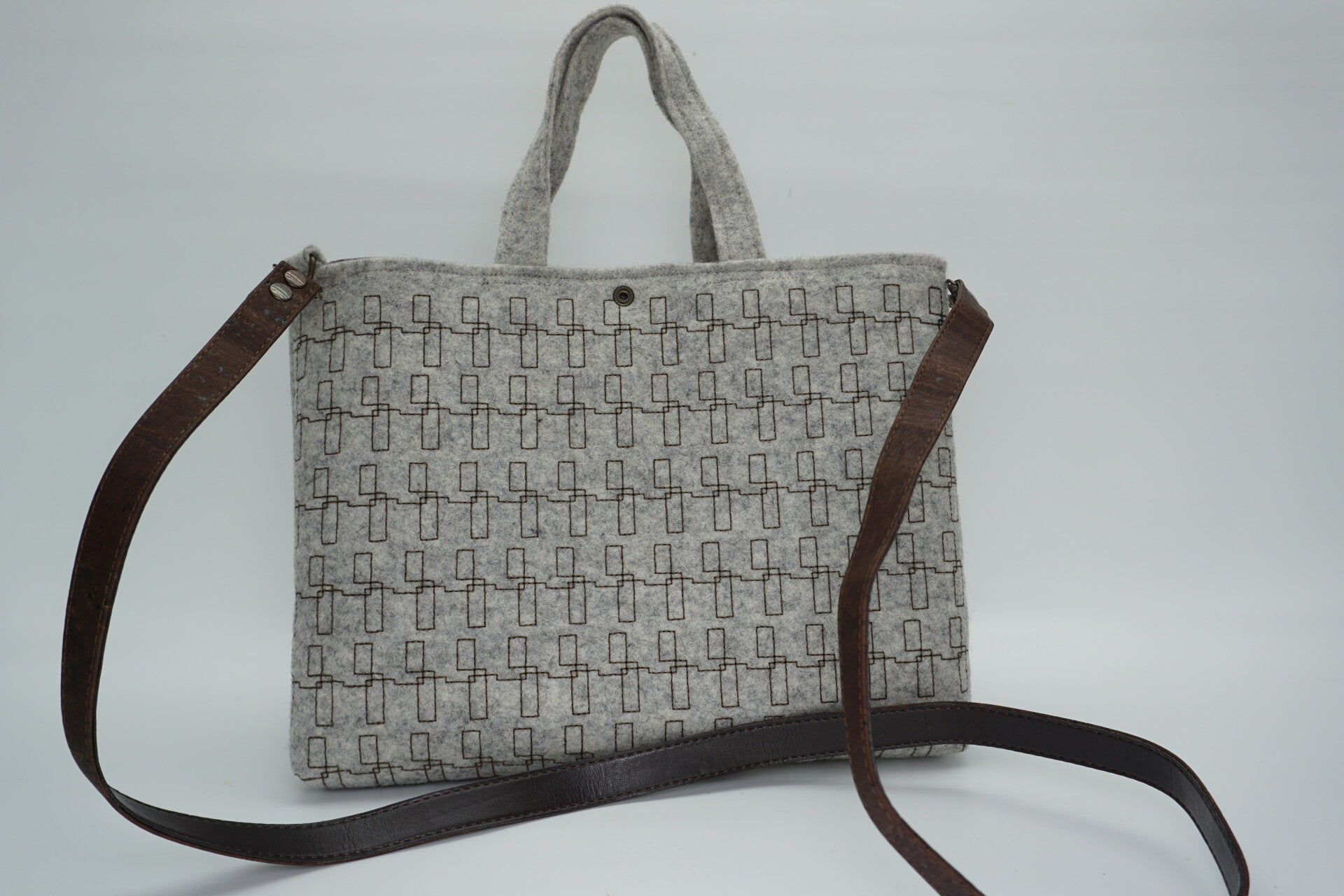 Licht grijze handtas/ cross bodytas van bio wolvilt met siersteken
