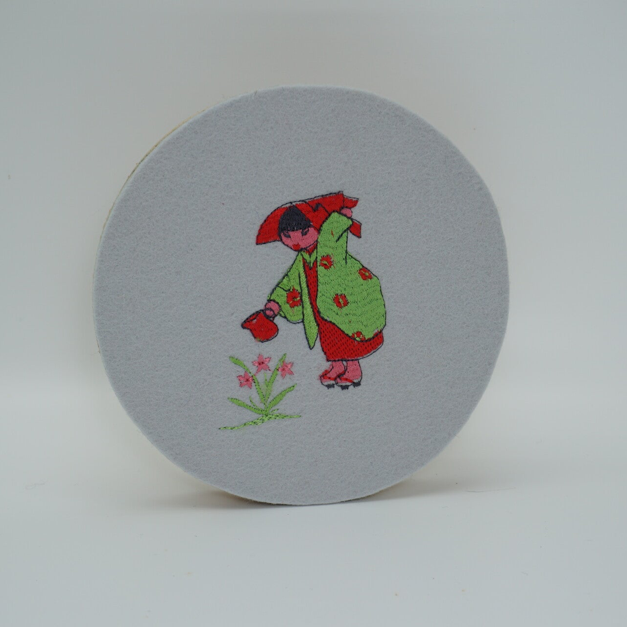 Wand decoratie van wolvilt met borduurpatroon