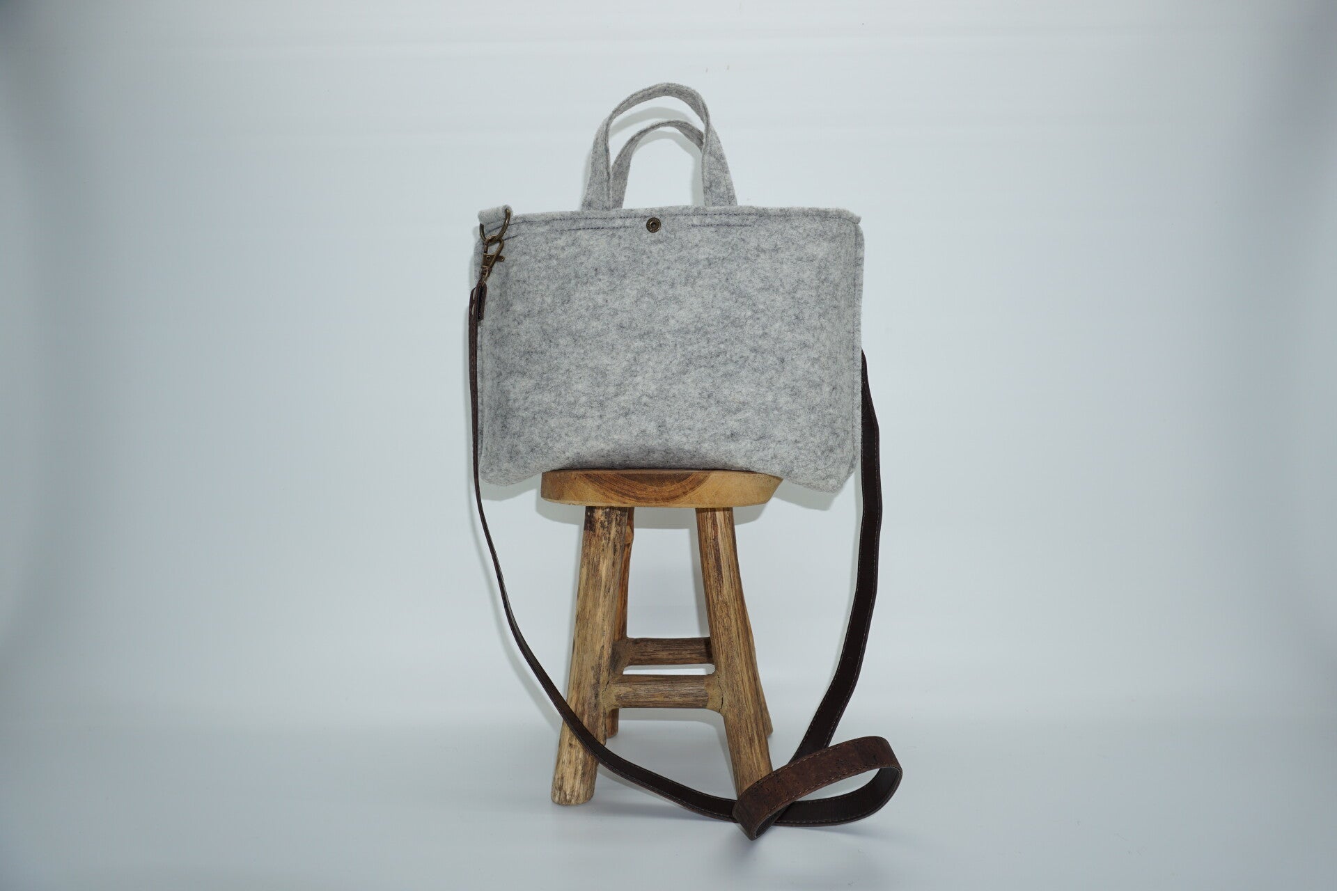 Lichtgrijze handtas/crossbodytas van bio wolvilt met siersteken